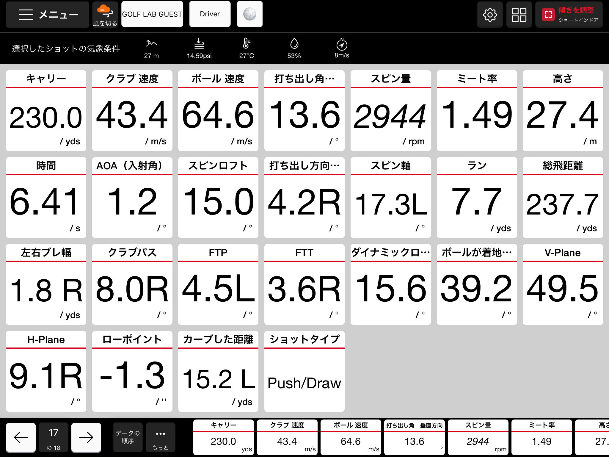 腱鞘炎で左腕が痛く、右腕まで痛くなってきましたが、Mevo+のデータを確認したくて。痛いのを我慢して打ってみました。