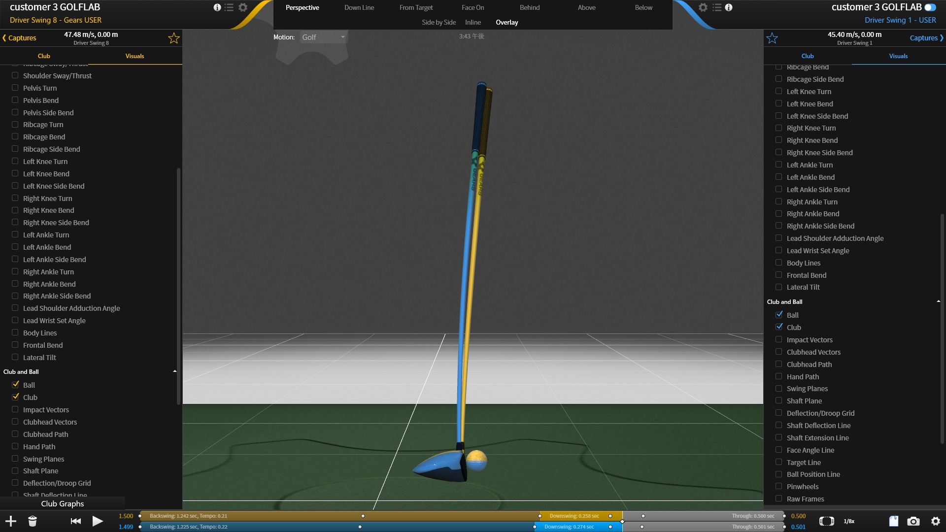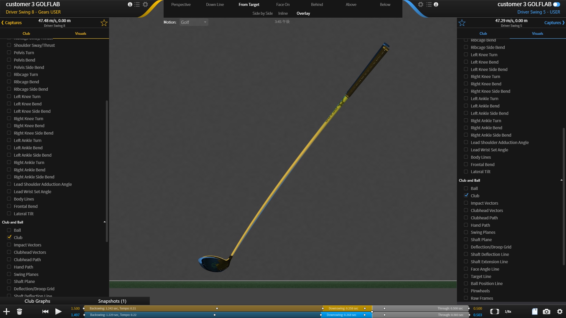 下の画像は先日のお客様ですが、全く同じシャフトで、ある部分が違うクラブの撓り具合です。