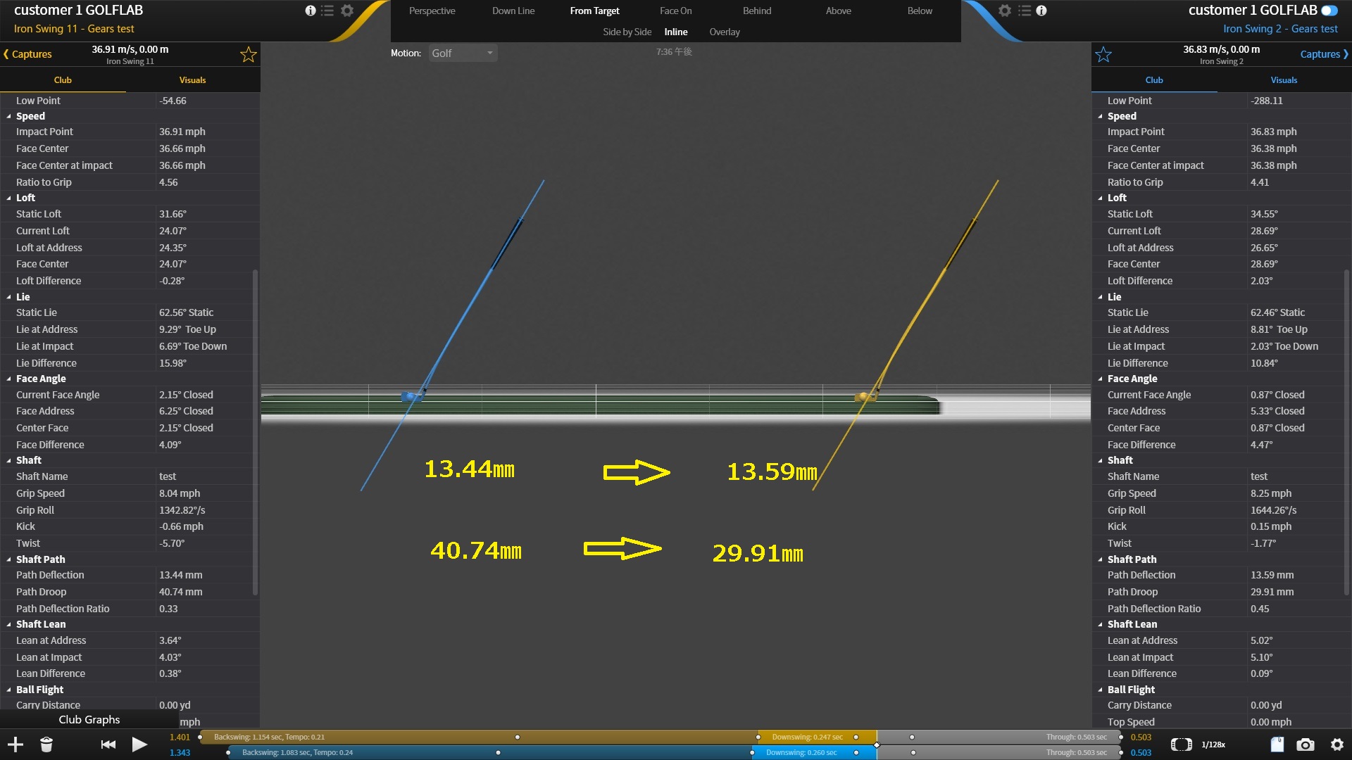 左のシャフトでは、明らかにトゥダウンが増え、良い感じになりました。