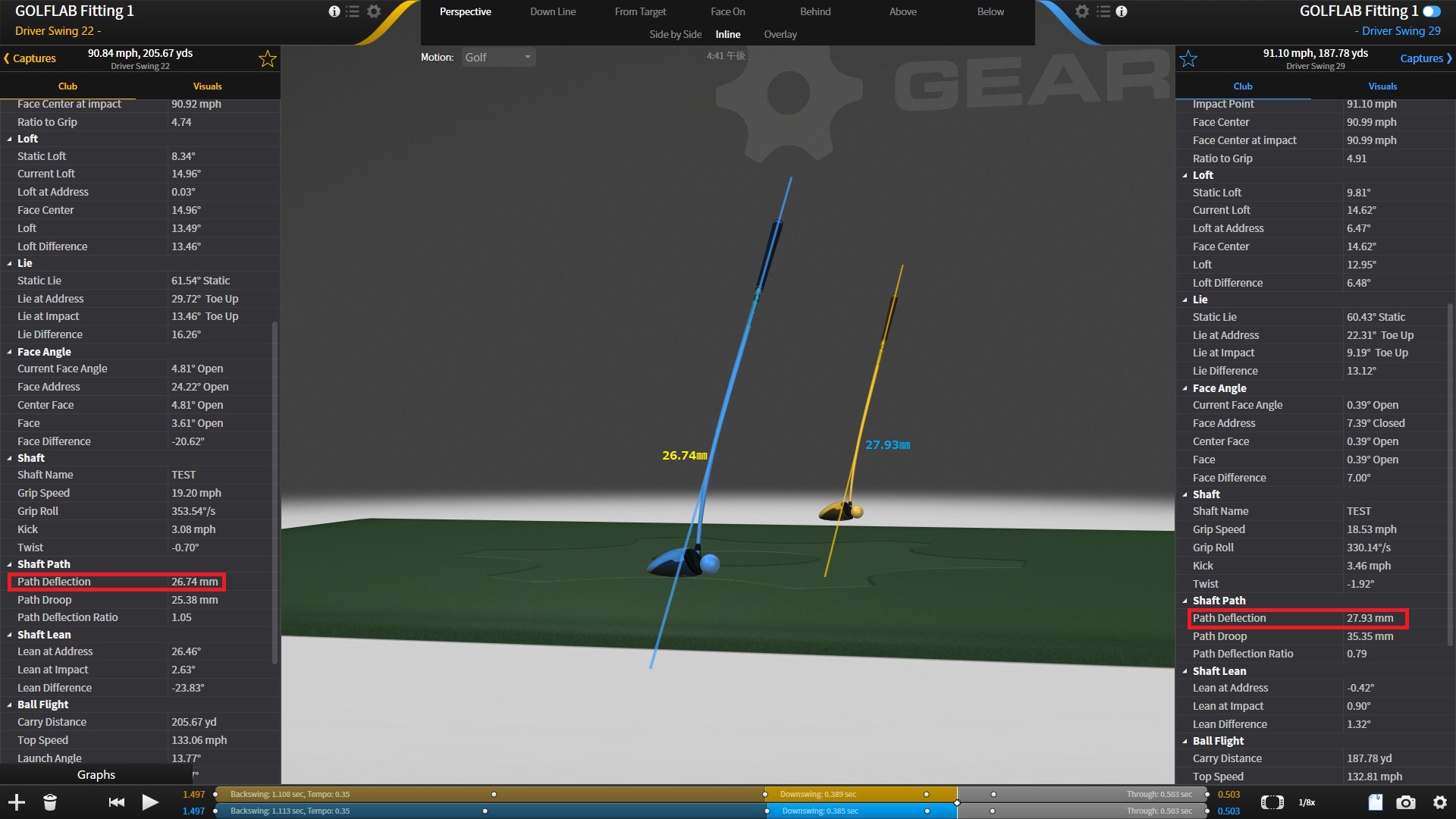 次の画像は、硬いシャフトと軟らかいシャフトの比較です↓